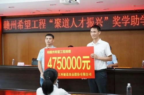 设立“聚道人才振兴”奖学助学基金,汇聚社会爱心力量帮助赣州学子成长成才,助力赣南乡村人才振兴,向赣州希望工程捐赠475万元。聚道食品董事长刘建勇承诺:聚道食品将在2021年至2025年共5年,每年捐资95万元,每年资助赣州学子300名,总捐资额475万元。2021年,“聚道人才振兴”奖学助学基金将资助300名品学兼优的大学新生和高中生。
