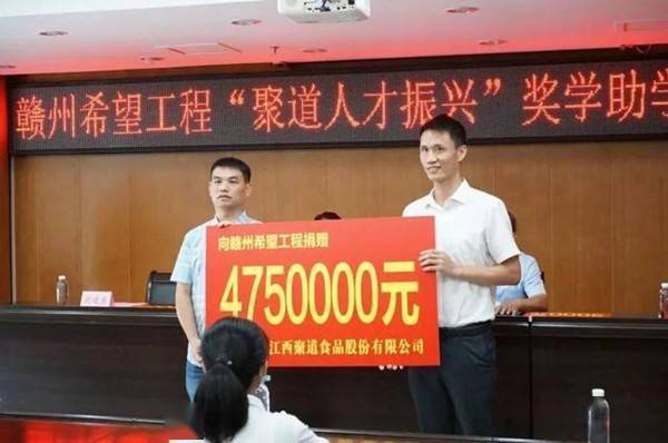 他们还设立了“聚道人才振兴”奖学助学基金,汇聚社会爱心力量帮助赣州学子成长成才,助力赣南乡村人才振兴,向赣州希望工程捐赠475万元。聚道食品董事长刘建勇承诺:聚道食品将在2021年至2025年共5年,每年捐资95万元,每年资助赣州学子300名,总捐资额475万元。2021年,“聚道人才振兴”奖学助学基金将资助300名品学兼优的大学新生和高中生,首次涵盖瑞金、会昌、寻乌、安远、于都等5个县市,其中资助瑞金学子100人。目前,300名学生名单经相关县(市)教科体局和团委收集汇总、走访审核,助学金拨付到学生(或家长)的银行账户。